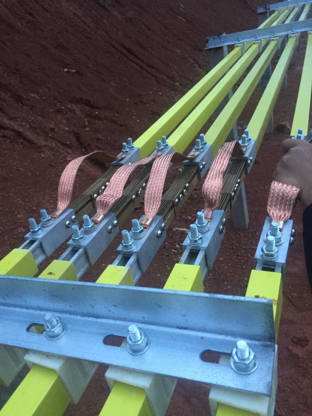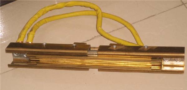 膨胀段是根据滑触线在不同温度环境工作的情况下,对滑触线在热胀冷缩时所产生的直线形变(型? 材挤压对顶)和冷缩时(型材收缩)而造成断电而设计的。它由两个可移动段与滑触线干线本体直截串联连接而成,其基本原理为:它由相对的静态滑片和动态滑片叠插组成一个与滑触线本体截面相吻合的过渡体,在滑触线环境温度变化时可自由地进行直线移动。由于静态滑片和动态滑片叠插后,无论怎样伸展与收缩,它都能够给集电器的电刷一个直线过渡的平面,从而克服了较早时期膨胀接头而带来的膨胀范围窄,集电器电刷跨越困难而造成断电,接触面变小而跳火等故障。由于静态滑片和动态滑片两端与滑线本体直截连接后,同时又设置两根滑动导杆将静态滑片和动态滑片穿插导向,因此,它具有良好的同轴度。与此同时,在静态滑片和动态滑片两端的上方还设置两根与滑接片相并联的软电缆,从而稳定和增加该膨胀段的载流量,使整个系统不致于因膨胀段的设置而影响整线额定载流量 .膨胀段的可伸缩范围可在 0~200mm之间调节,可以吸收滑线导轨本体材料为铝、铜,膨胀点距离150米/段、周边环境温度-40℃~+115℃时,所产生膨胀系数而引发的伸缩距离,并使集电器能顺畅通过而不影响其供电质量。